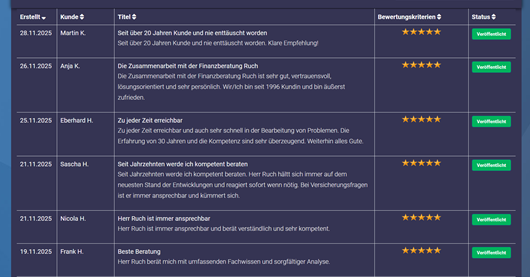 Durch meine langjährige Zugehörigkeit zu WhoFinance und die zahlreichen positiven Bewertungen meiner Kundinnen und Kunden durfte ich mich über viele Jahre hinweg bundesweit unter den Top 10 aller Finanzberater wiederfinden – mit über 900 Kundenbewertungen. Das ist alles andere als selbstverständlich.